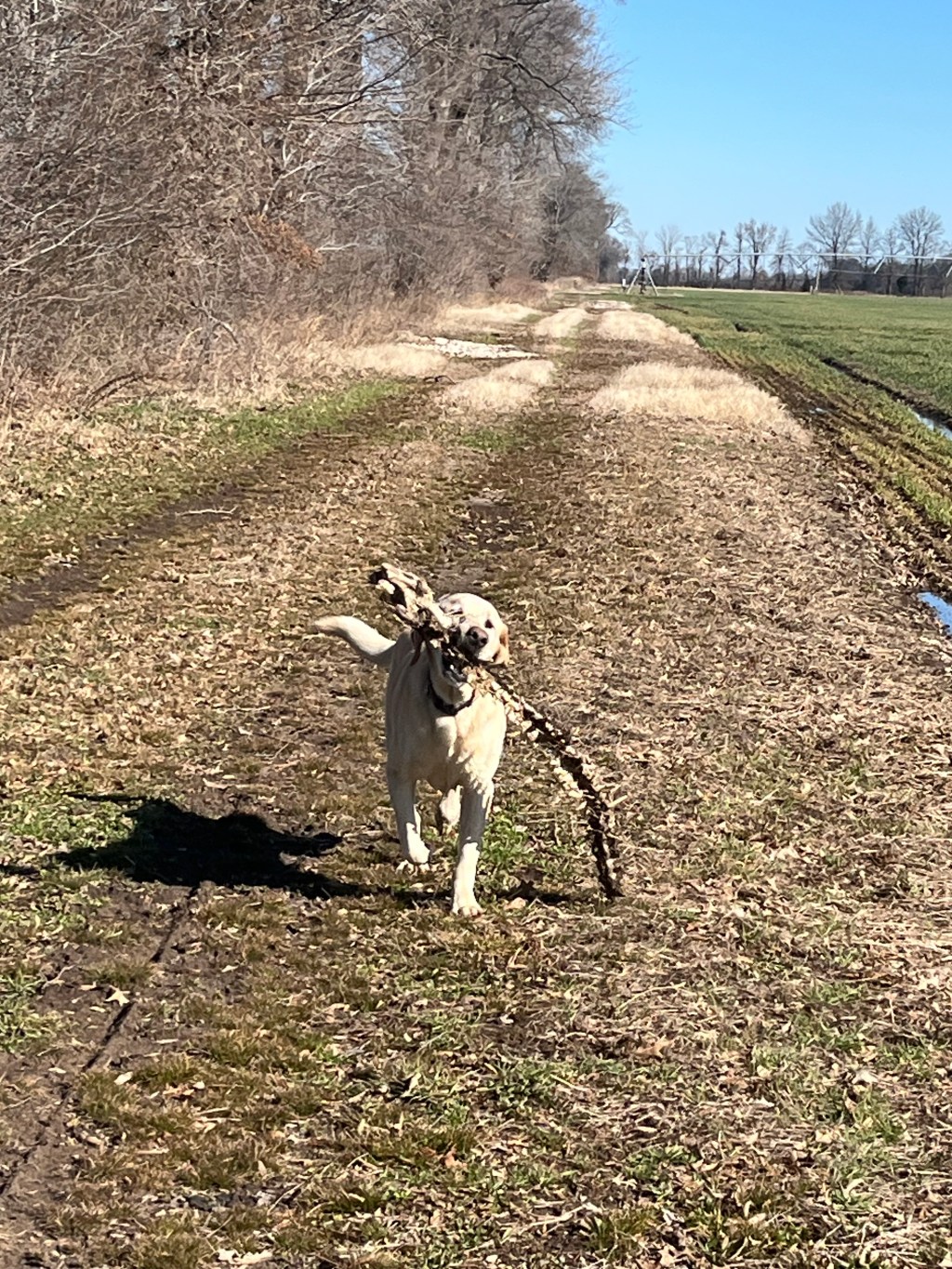 A week or so ago, we had been out and were walking back. I noticed Woody wasn’t ahead of me. That’s a bit unusual, so I turned to see why he was lagging behind. He was coming along, but his progress was slowed because he was attempting to drag the entire spine of a deer home. He’s a big dog, but the spine was longer than he was tall, and so the end of it bumped along on the ground and would get hung up. Every now and then he would set it down to readjust his grip. We were more than a mile from home when he found this “treasure.”